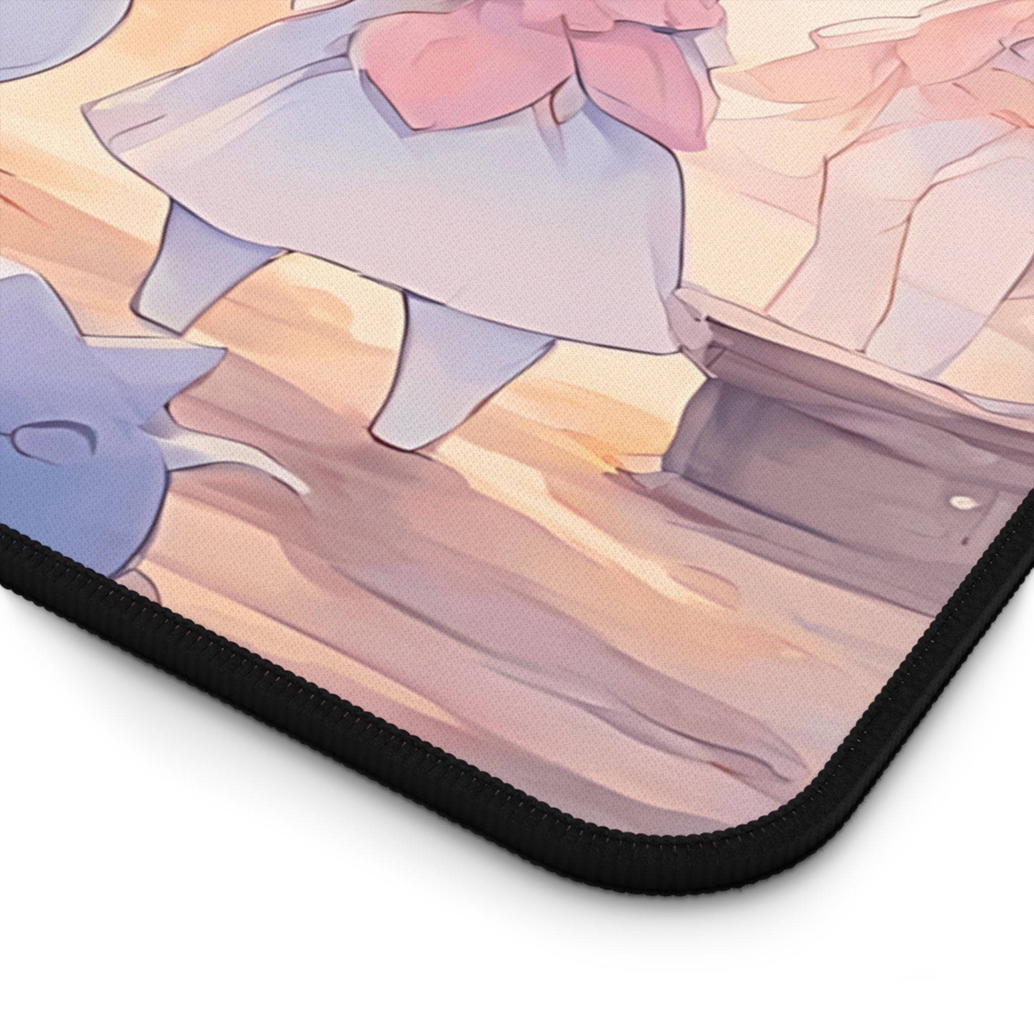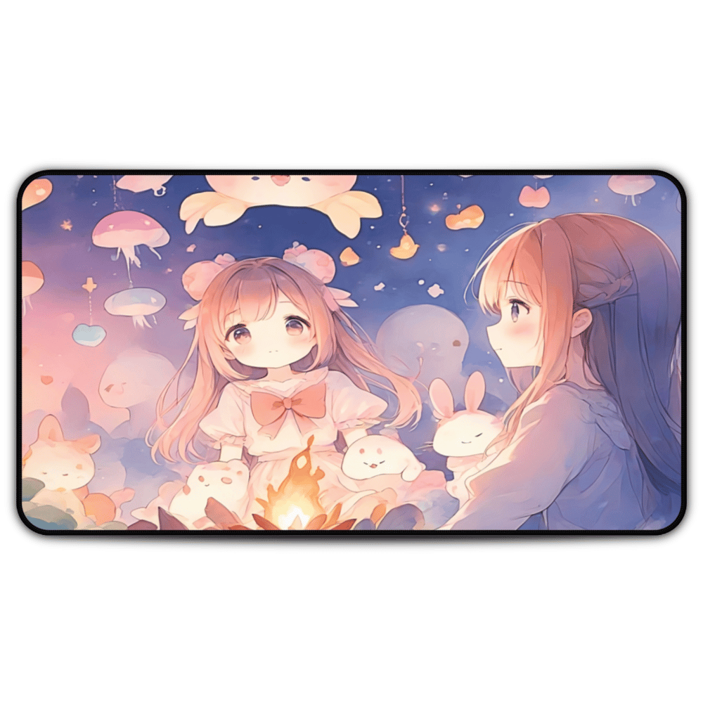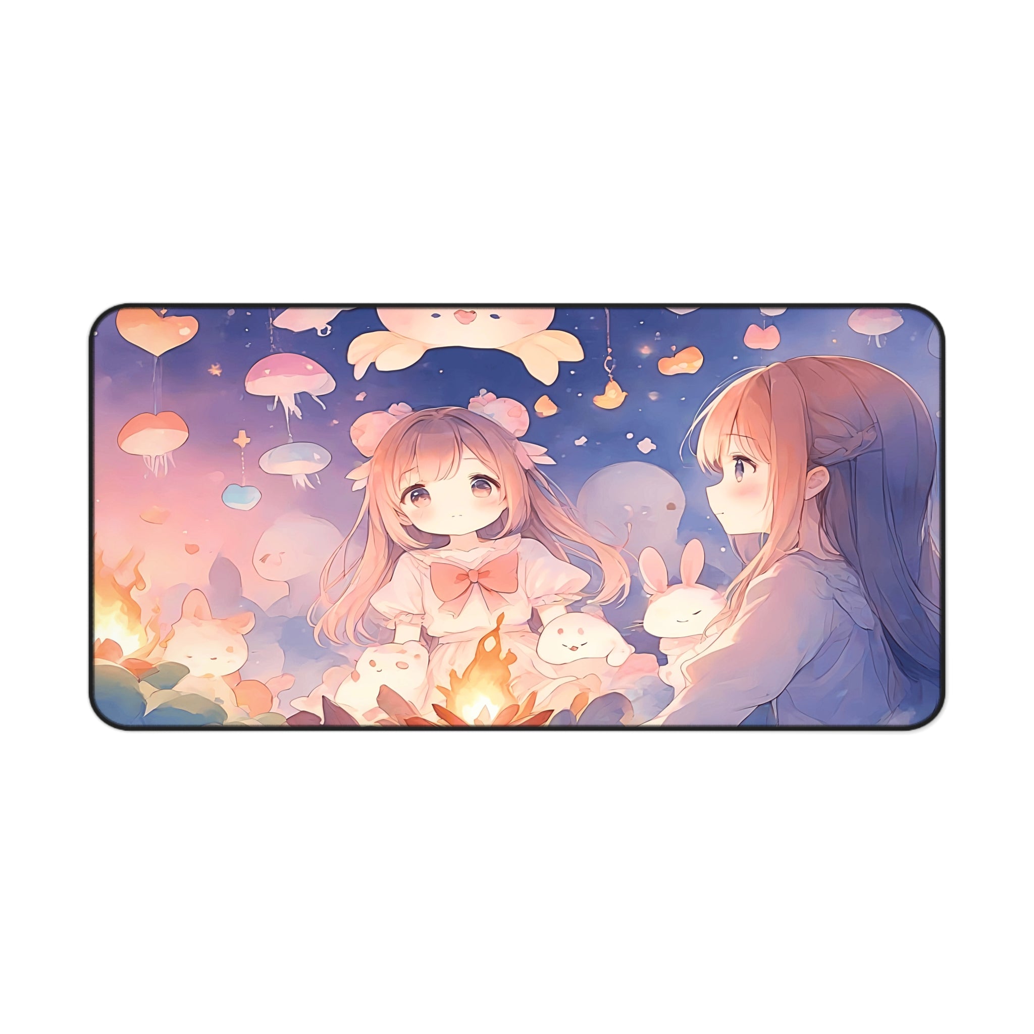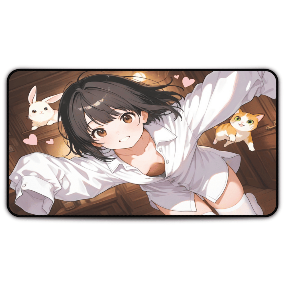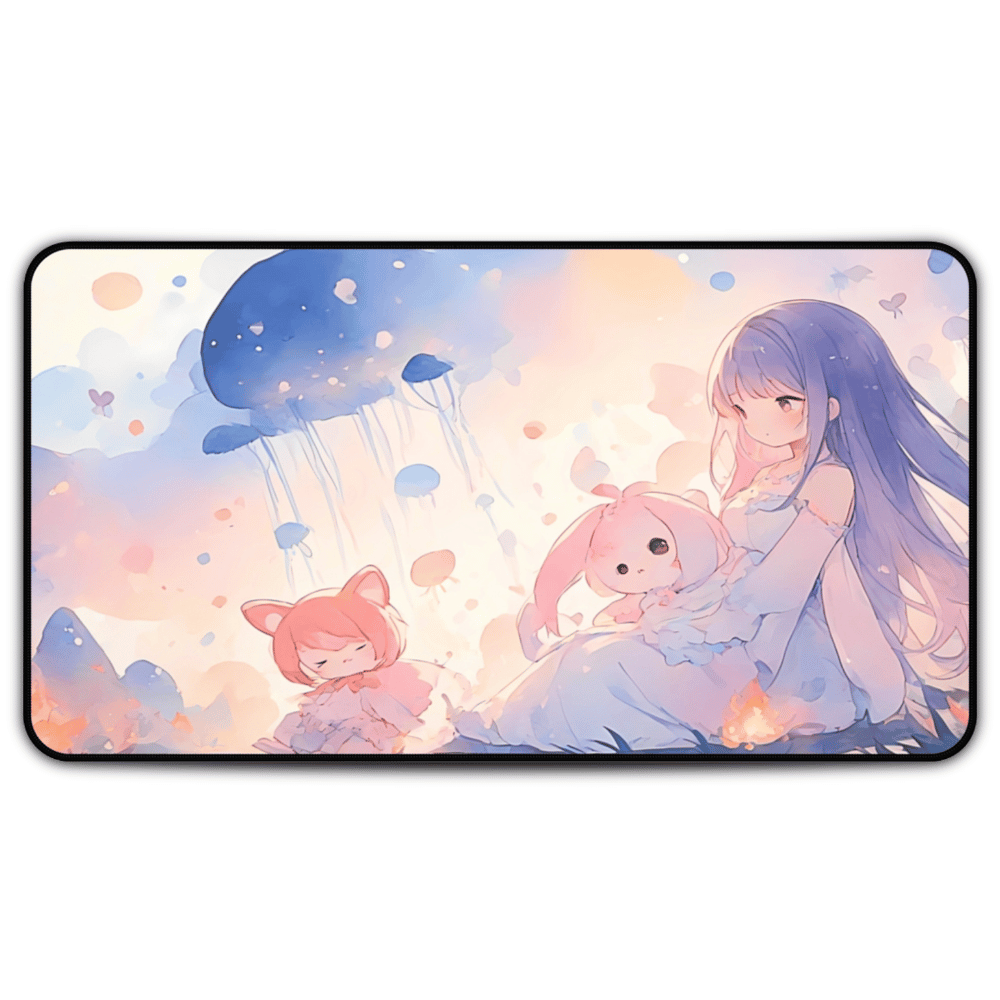 Bedtime Joy – Cute Anime Girl with Bunny & Cat Desk Mat